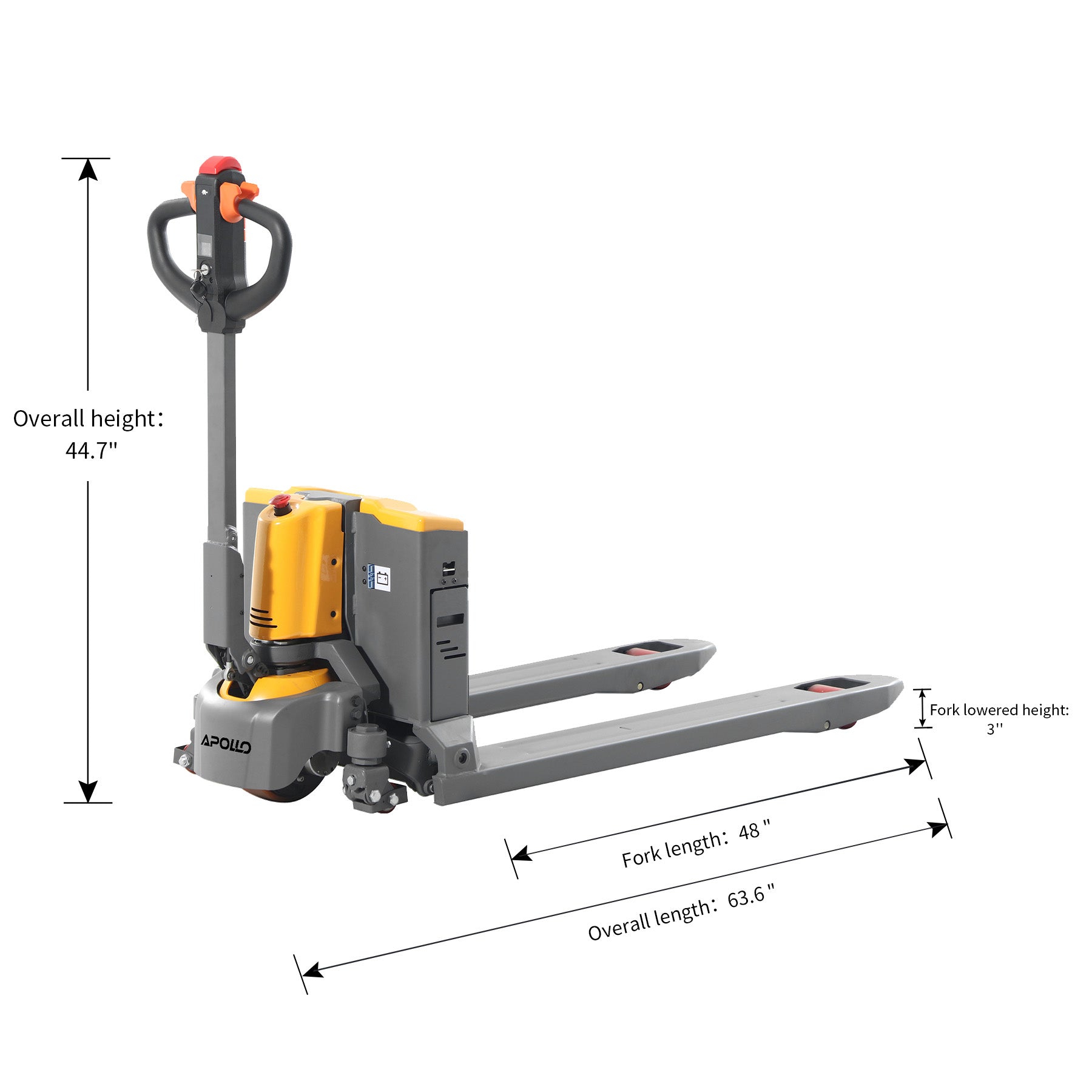 Li-ion Powered Pallet Truck| 3300 lb| Lowered Ht. 3 in| Fork Size 48 x 27"| Wt. 290 lb| 24V/20AH| Apollo Forklift A-1037